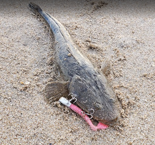 朝マズメの仙南サーフでキャッチしたマゴチ。ヒットルアーはもちろん「サリュー」!